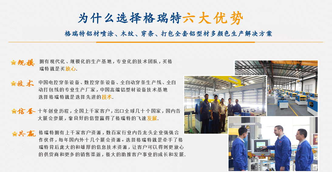 格瑞特--铝材喷涂、木纹、穿条、打包 全套铝型材多颜色生产解决方案 。